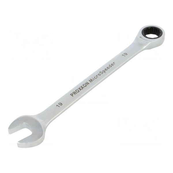 Klucz płasko-oczkowy został wyposażony w mechanizm z grzechotką, co umożliwia szybką pracę w miejscach o ograniczonej przestrzeni. Narzędzie posiada rozmiar 19mm i cechuje się konstrukcją przystosowaną do obsługi połączeń śrubowych.