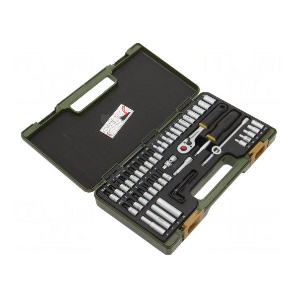 Zestaw narzędzi nasadowych zawiera 50 elementów przeznaczonych do prac montażowych i serwisowych. Komplet obejmuje grzechotkę 1/4" oraz zestaw nasadek 6-kątnych i nasadek typu Torx, co umożliwia obsługę szerokiego zakresu połączeń śrubowych.