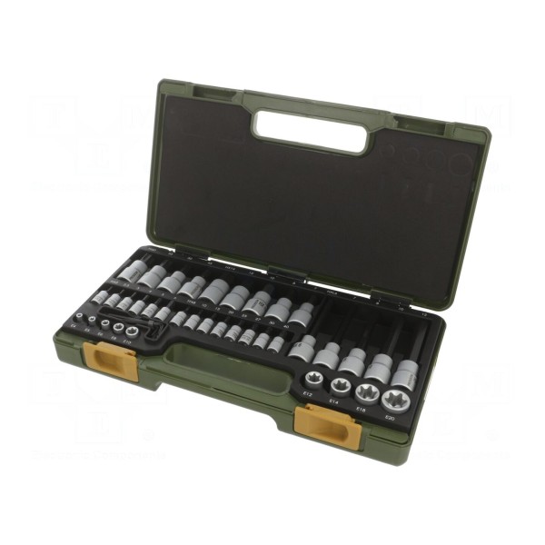 W zestawie: 4 przedłużki, klucze imbusowe metryczne o rozmiarze 1,25; 1,5; 2,0; 3,0 mm, nasadki do świec zapłonowych 16 i 21mm, nasadki zewnętrzne TORX: E4, E5, E6, E8, E10, E12, E14, E18, przegub Cardana: 2 szt., uchwyt wkrętakowy.