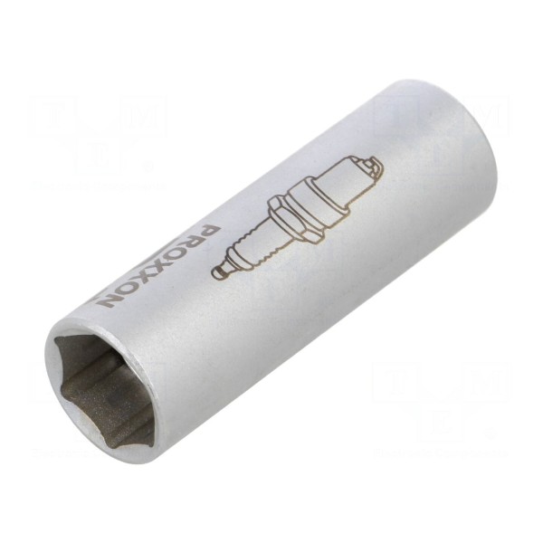 Nasadka marki PROXXON to narzędzie typu nasadowego przeznaczone do obsługi świec zapłonowych. Element wyposażony jest w gniazdo o rozmiarze 1/2" oraz końcówkę o średnicy 16 mm.