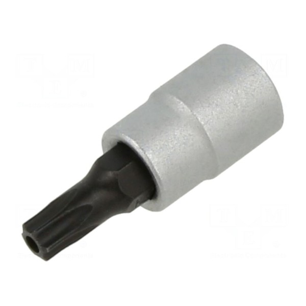 Nasadka typu Torx z zabezpieczeniem przeznaczona do współpracy z uchwytami o rozmiarze 1/4". Narzędzie posiada końcówkę o rozmiarze T25H. Całkowita długość elementu wynosi 33mm. Konstrukcja umożliwia wykorzystanie nasadki w pracach wymagających użycia kluczy z gniazdem typu Torx z otworem.