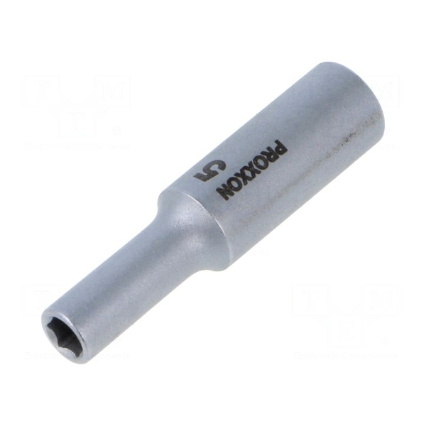 Nasadka 6-kątna typu nasadowego przeznaczona do współpracy z uchwytami o rozmiarze 1/4". Element posiada gniazdo HEX o wymiarze 5 mm. Produkt charakteryzuje się konstrukcją 6-kątną, co pozwala na dopasowanie do odpowiednich śrub i elementów złącznych. Narzędzie zostało wykonane zgodnie ze standardami dla mocowań 1/4".