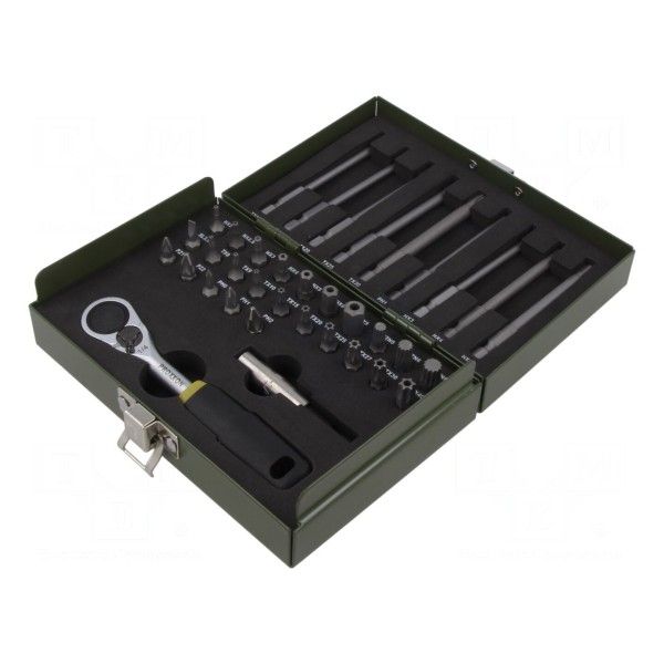 Zestaw zawiera 36 elementów, w skład których wchodzi grzechotka oraz szeroka gama końcówek wkrętakowych. Dostępne rodzaje grotów obejmują profile typu imbus, Phillips, płaski, Pozidriv, spline oraz Torx z zabezpieczeniem, co pozwala na obsługę wielu standardów śrub.