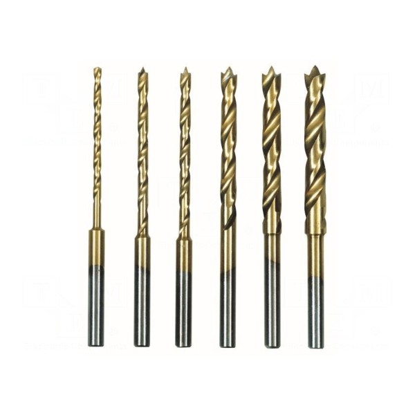 Zestaw zawiera sześć wierteł przeznaczonych do obróbki metalu, wykonanych ze stali szybkotnącej HSS. Narzędzia zostały dodatkowo pokryte warstwą azotku tytanu, co wpływa na ich właściwości użytkowe podczas pracy.