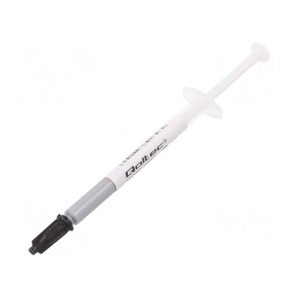 Pasta termoprzewodząca QOLTEC w kolorze srebrnym wykazuje przewodność cieplną na poziomie 3,17W/mK oraz rezystancję termiczną o maksymalnej wartości 0,067°C/W. Produkt zapewnia właściwości izolacyjne oraz poprawia przewodność cieplną pomiędzy stykiem procesora a podstawą układu chłodzenia.