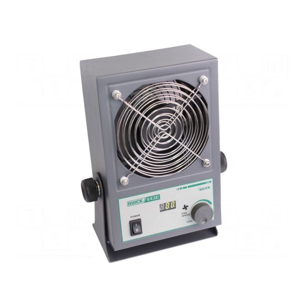 Jonizator powietrza QUICK 443C to urządzenie stołowe przeznaczone do neutralizacji ładunków elektrostatycznych w obszarze pracy. Urządzenie generuje napięcie wyjściowe 5kV oraz zapewnia przepływ powietrza na poziomie 2400l/min, co pozwala na skuteczne działanie w zasięgu od 0,4 do 1,5m. Równowaga jonowa wynosi ±10V.