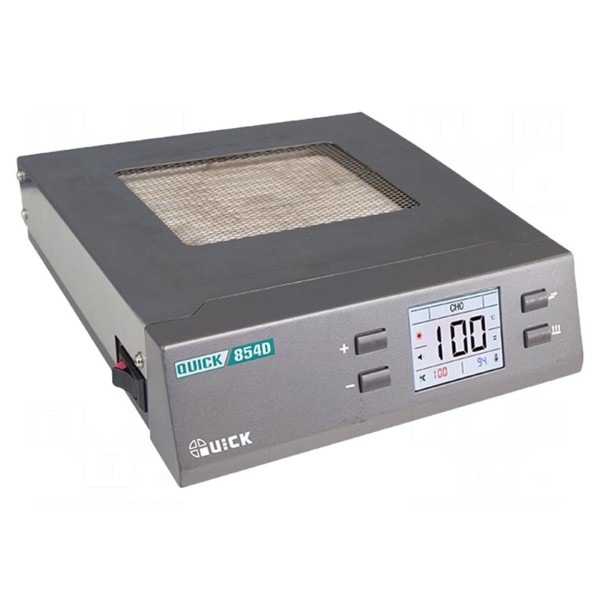 Urządzenie typu podgrzewacz charakteryzuje się mocą 0,4kW i przeznaczone jest do podgrzewania płytek PCB przed montażem oraz demontażem komponentów elektronicznych. Zakres regulacji temperatury pracy wynosi od 50 do 500°C, co pozwala na dostosowanie ciepła do różnych wymagań technologicznych procesu lutowania.