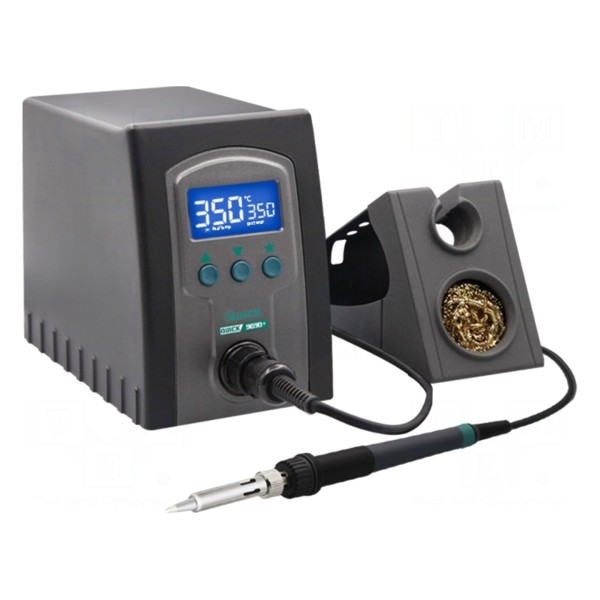 Stacja lutownicza QUICK 969D+ o mocy 70W przeznaczona jest do precyzyjnych prac montażowych i serwisowych. Urządzenie pracuje w zakresie temperatur od 100°C do 480°C z cyfrową stabilnością na poziomie ±2°C. Kontrola parametrów odbywa się za pomocą przycisków, a aktualny stan pracy jest prezentowany na wyświetlaczu LCD.