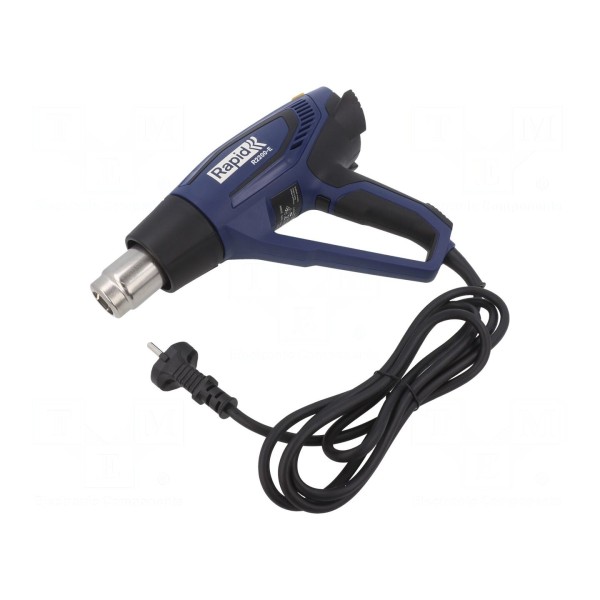 Opalarka elektryczna RAPID R2200-E charakteryzuje się mocą 2,2kW oraz zasilaniem napięciem 230V AC. Urządzenie oferuje dwa poziomy przepływu powietrza: 250l/min oraz 500l/min, co pozwala na dostosowanie parametrów pracy do bieżących potrzeb. Użytkownik ma możliwość wyboru jednej z trzech temperatur strumienia powietrza: 60°C, 350°C lub 600°C.