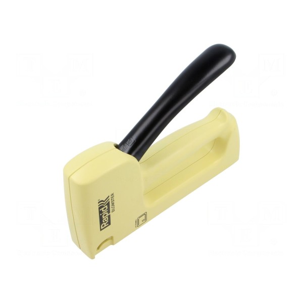 Zszywacz wykonany z trwałego tworzywa sztucznego w kolorze żółtym. Narzędzie zostało wyposażone w mechanizm eliminujący zjawisko odrzutu podczas pracy.