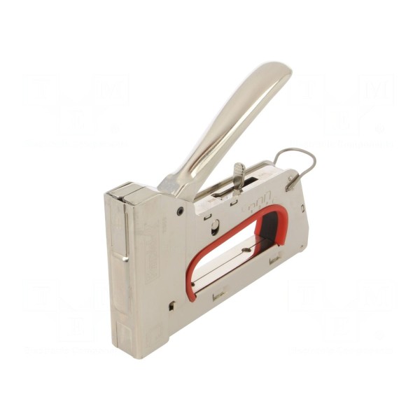 Zszywacz to narzędzie ręczne przeznaczone do prac montażowych. Korpus urządzenia został wykonany ze stali, co wpływa na jego trwałość podczas eksploatacji.