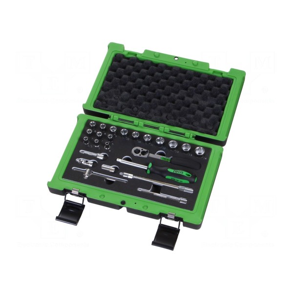 W zestawie: grzechotka, pokrętło, przedłużka, przegub Cardana. Całość została umieszczona w walizce, która ułatwia przechowywanie oraz transport narzędzi.