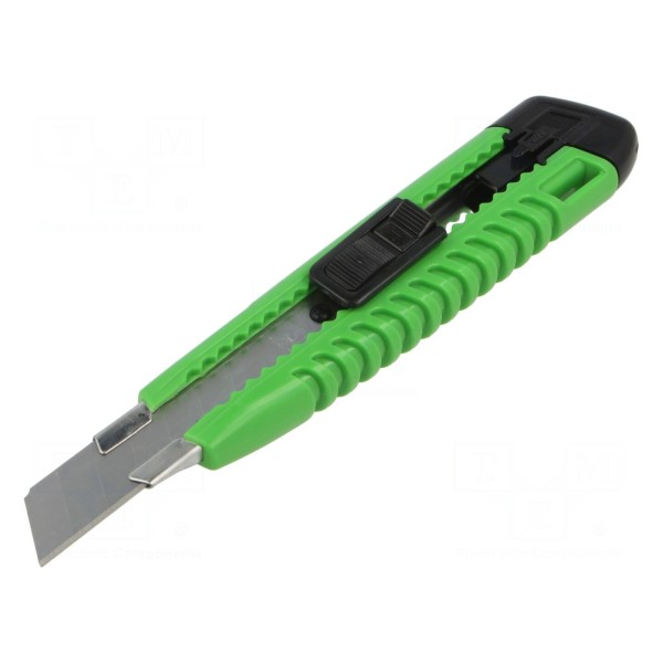 Nóż o długości całkowitej 145 mm wyposażony jest w ostrze wysuwane typu łamanego, co umożliwia szybkie odłamanie zużytego segmentu i korzystanie z ostrej krawędzi tnącej. Szerokość robocza narzędzia wynosi 18 mm.