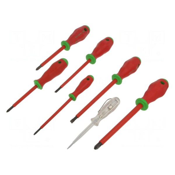 Zestaw zawiera siedem wkrętaków izolowanych z grotami typu Phillips oraz płaskimi, przeznaczonych do prac przy instalacjach elektrycznych. Narzędzia zostały wykonane ze stali chromowo-wanadowo-molibdenowej, co zapewnia odpowiednią wytrzymałość materiałową podczas eksploatacji.