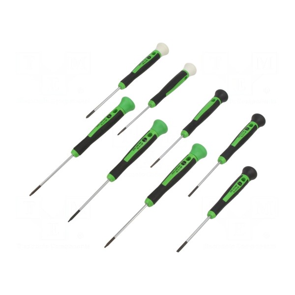 Zestaw obejmuje 8 wkrętaków precyzyjnych wyposażonych w groty typu Phillips, płaskie oraz Torx. Narzędzia wykonano ze stali chromowo-wanadowo-molibdenowej, co zapewnia parametry techniczne wymagane przy pracach precyzyjnych.