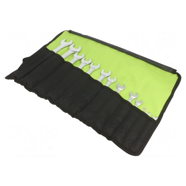 Zestaw zawiera 12 kluczy płasko-oczkowych wykonanych ze stali chromowo-wanadowej. Narzędzia spełniają wymogi normy DIN 3113.