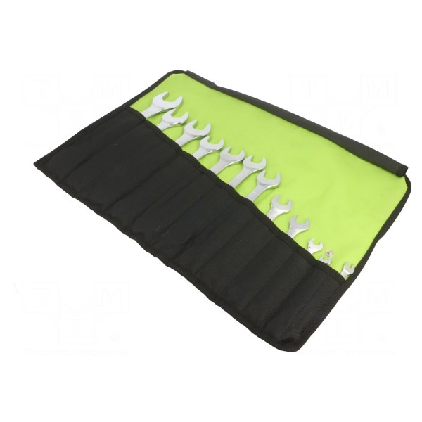 Zestaw zawiera 12 kluczy płaskich, które zostały wykonane ze stali chromowo-wanadowej. Narzędzia spełniają wymagania normy DIN 3110.