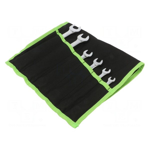 Zestaw narzędzi zawiera 6 elementów typu klucze płasko-oczkowe wyposażone w mechanizm grzechotkowy. Narzędzia zostały wykonane ze stali chromowo-wanadowej. W skład zestawu wchodzi futerał umożliwiający przechowywanie i transport narzędzi. Komplet przeznaczony jest do prac montażowych i serwisowych wymagających użycia kluczy o różnych konfiguracjach.