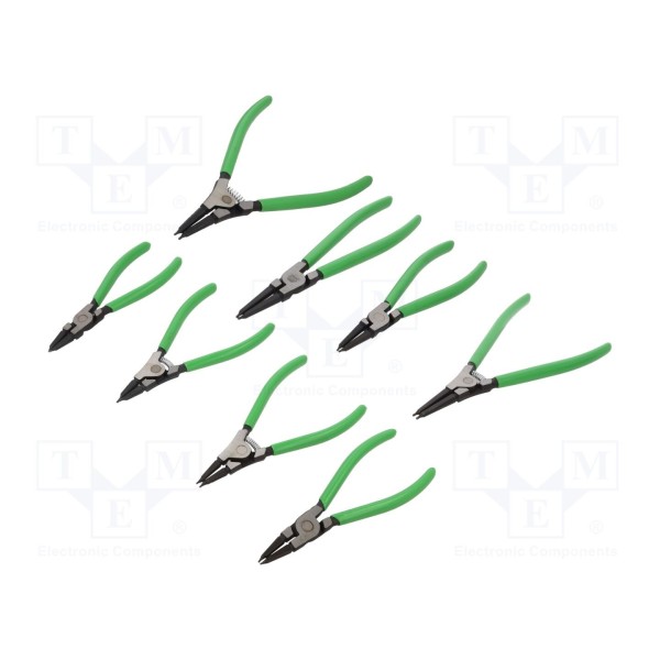 Zestaw zawiera 8 sztuk szczypiec przeznaczonych do montażu i demontażu pierścieni osadczych wewnętrznych oraz zewnętrznych. Narzędzia wykonano ze stali stopowej, co przekłada się na ich właściwości użytkowe przy pracach warsztatowych.