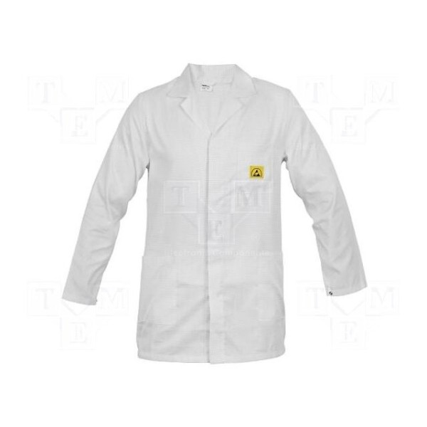Fartuch antystatyczny typu ESD wykonany został z mieszanki bawełny, poliestru oraz włókna węglowego, co zapewnia właściwości rozpraszające ładunki elektryczne. Odzież charakteryzuje się gramaturą materiału na poziomie 160g/m² i przeznaczona jest do ochrony w środowiskach wymagających zabezpieczeń przed wyładowaniami elektrostatycznymi. Model w rozmiarze S (unisex) utrzymany jest w białej kolorystyce.