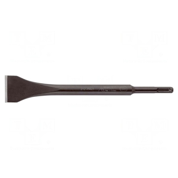 Konstrukcja elementu obejmuje wygiętą końcówkę roboczą o szerokości 40mm, co umożliwia efektywne kucie. Całkowita długość narzędzia wynosi 0,25m, a standard uchwytu SDS-Plus zapewnia kompatybilność z odpowiednimi elektronarzędziami.
