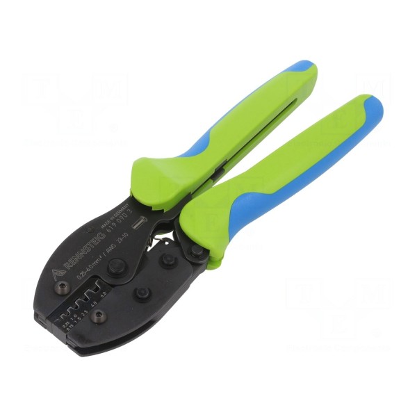 Narzędzie przeznaczone jest do zaciskania tulejek cienkościennych na przewodach o przekrojach od 0,25mm² do 6mm². Zakres obsługiwanych przekrojów obejmuje wartości: 0,25–0,75mm², 1–1,5mm², 2,5mm², 4mm² oraz 6mm².