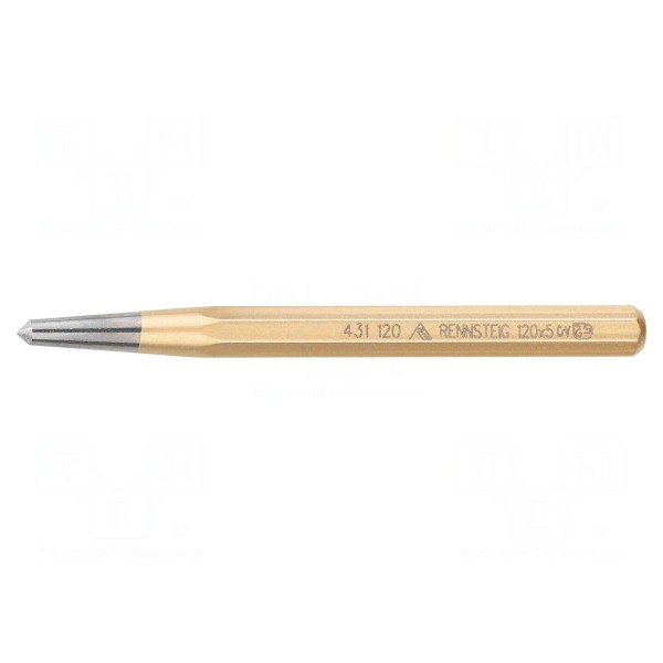 Punktak RENNSTEIG 431 120 0 to narzędzie ręczne przeznaczone do precyzyjnego punktowania materiałów. Produkt charakteryzuje się długością całkowitą wynoszącą 120 mm oraz średnicą końcówki roboczej równą 5 mm.