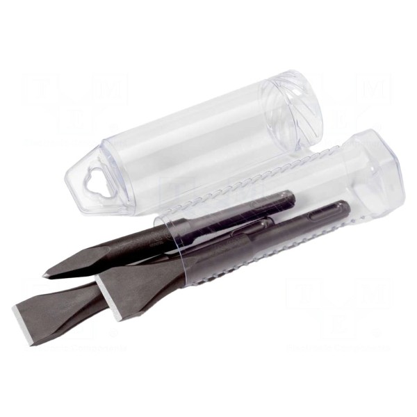 W zestawie znajdują się trzy elementy przeznaczone do prac budowlanych i remontowych. W skład pakietu wchodzą: dłuto x2, szpicak do kucia.