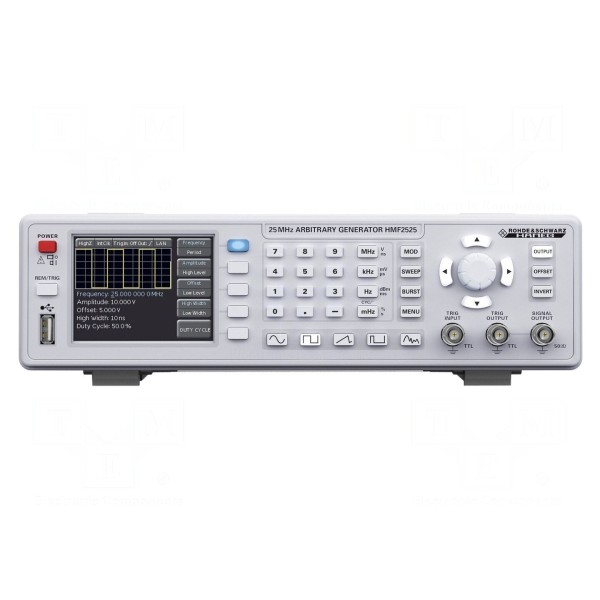 Generator laboratoryjny ROHDE & SCHWARZ HMF2525 to urządzenie jednokanałowe o maksymalnej częstotliwości przebiegu wynoszącej 25MHz. Sprzęt obsługuje szeroki wachlarz przebiegów, w tym sinus, prostokątny, trójkątny, ramp, impuls, szum oraz przebieg arbitralny. Zakres częstotliwości pracy jest zależny od typu generowanego sygnału i wynosi od 10µHz w dolnej granicy do 25MHz dla przebiegów sinus i prostokątnych. Urządzenie oferuje rozdzielczość pionową 14 bitów oraz próbkowanie na poziomie 250Msps.