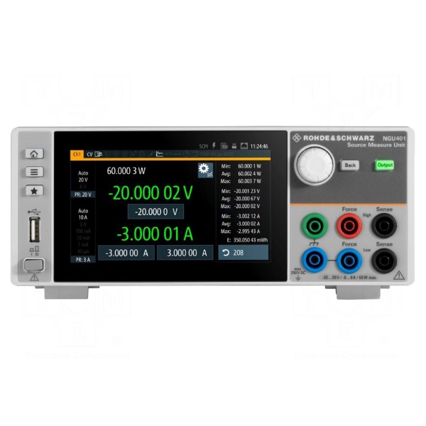 Jednostka pomiarowo-zasilająca ROHDE & SCHWARZ NGU401-G to urządzenie z pojedynczym kanałem wyjściowym, oferujące napięcie w zakresie od -20V do 20V oraz prąd wyjściowy do 8A. Całkowita moc maksymalna tego modelu wynosi 60W. Przyrząd zapewnia precyzyjne odczyty z rozdzielczością pomiaru napięcia 50µV DC oraz rozdzielczością pomiaru prądu 100nA.