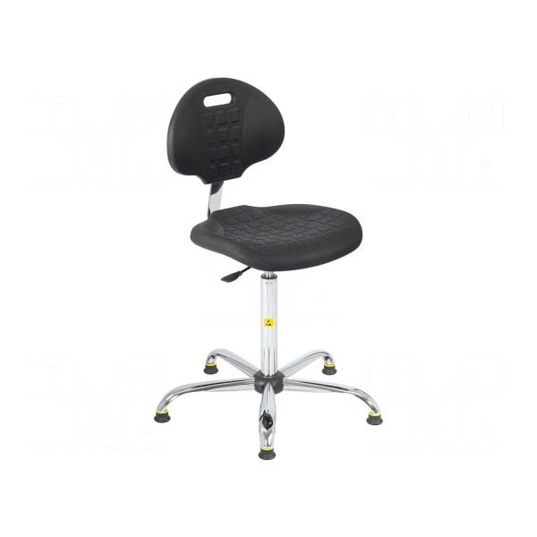 Krzesło antystatyczne wykonane z poliuretanu w kolorze czarnym, przeznaczone do bezpiecznej pracy w strefach chronionych elektrostatycznie. Konstrukcja posiada siedzisko o wymiarach 440x465mm oraz oparcie o wymiarach 310x420mm. Zastosowany amortyzator gazowy umożliwia płynną regulację wysokości siedziska w zakresie od 580mm do 830mm. Urządzenie jest wyposażone w mechanizm pozwalający na regulację kąta nachylenia siedziska oraz oparcia.