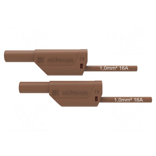 Z obu stron przewodu znajdują się izolowane wtyki bananowe 4 mm, wyposażone w dodatkowe gniazda osiowe 4 mm, co zwiększa możliwości łączeniowe w układach pomiarowych. Całość spełnia wymogi normy EN 61010 w kategorii CAT II 100 V. Kabel w kolorze brązowym jest przeznaczony do połączeń wewnątrz aparatury laboratoryjnej i diagnostycznej.