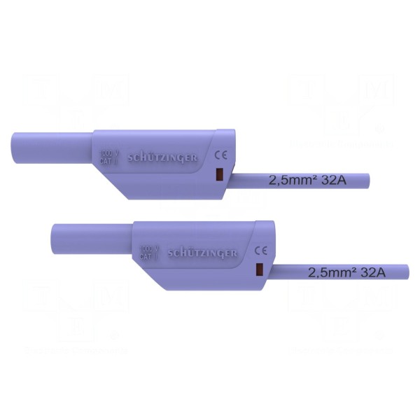 Złącza charakteryzują się niklowanym pokryciem styków, co przekłada się na maksymalną rezystancję styku na poziomie 17mΩ. Konstrukcja spełnia wymogi bezpieczeństwa zgodnie z normą EN 61010 dla kategorii CAT II 1000V. Fioletowy kolor przewodu umożliwia łatwą identyfikację w układach pomiarowych.