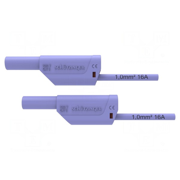 Przewód pomiarowy o długości 1m charakteryzuje się prądem znamionowym 16A oraz napięciem znamionowym 1kV. Wykonany został w oparciu o przewód o przekroju 1mm² z izolacją z PVC w kolorze fioletowym. Zakończenia stanowią wtyki bananowe 4mm umieszczone po obu stronach przewodu.