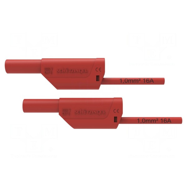 Przewód pomiarowy o długości 0,25 m został wyposażony w izolowane wtyki bananowe 4 mm z obu stron. Złącza posiadają zintegrowane gniazda osiowe 4 mm, co zwiększa elastyczność połączeń w układach pomiarowych. Przewód wykonany jest w kolorze czerwonym z izolacją z PVC.
