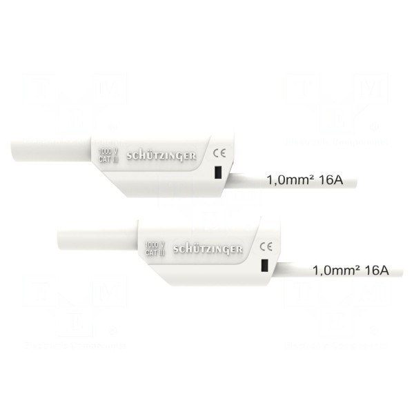 Przewód pomiarowy SCHÜTZINGER VSFK 8701 / 1 / 200 / WS o długości 2 m został wyposażony w obustronne wtyki bananowe 4 mm. Konstrukcja złącza obejmuje wersję izolowaną z dodatkowym gniazdem osiowym 4 mm, co umożliwia rozszerzenie połączeń pomiarowych. Elementy stykowe posiadają złocone pokrycie, a maksymalna rezystancja styku wynosi 27 mΩ.