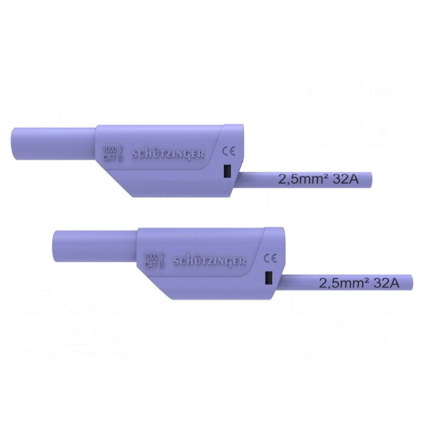 Przewód pomiarowy o długości 1 metra charakteryzuje się prądem znamionowym 32A oraz napięciem znamionowym 1kV. Wyposażony jest obustronnie we wtyki bananowe 4mm, które posiadają izolację oraz gniazda osiowe 4mm. Zastosowany przewód o przekroju 2,5mm² posiada zewnętrzną izolację wykonaną z tworzywa PVC w kolorze fioletowym.