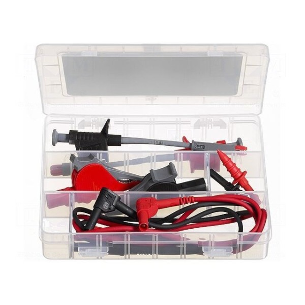 W zestawie: 2x przewód 1m wtyk bananowy prosty 4mm - wtyk bananowy kątowy 4mm, chwytak pomiarowy x2, końcówka pomiarowa x2, zacisk krokodylkowy x2.