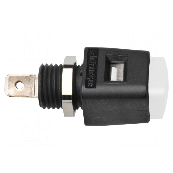 Zacisk laboratoryjny ESD 498 / WS marki SCHÜTZINGER to element przeznaczony do pracy z napięciem znamionowym 70V DC oraz natężeniem prądu do 16A. Złącze charakteryzuje się budową opartą na niklowanym styku oraz izolacji wykonanej z poliamidu w kolorze białym.