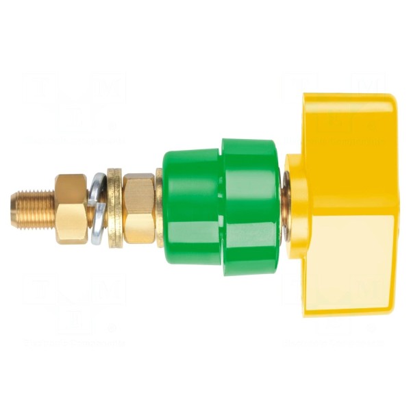 Zacisk laboratoryjny w kolorze żółto-zielonym przeznaczony jest do pracy przy napięciu znamionowym 1kV DC oraz prądzie znamionowym do 100A. Konstrukcja elementu bazuje na stykach wykonanych z mosiądzu, które dla zapewnienia trwałości pokryte zostały mosiądzem.