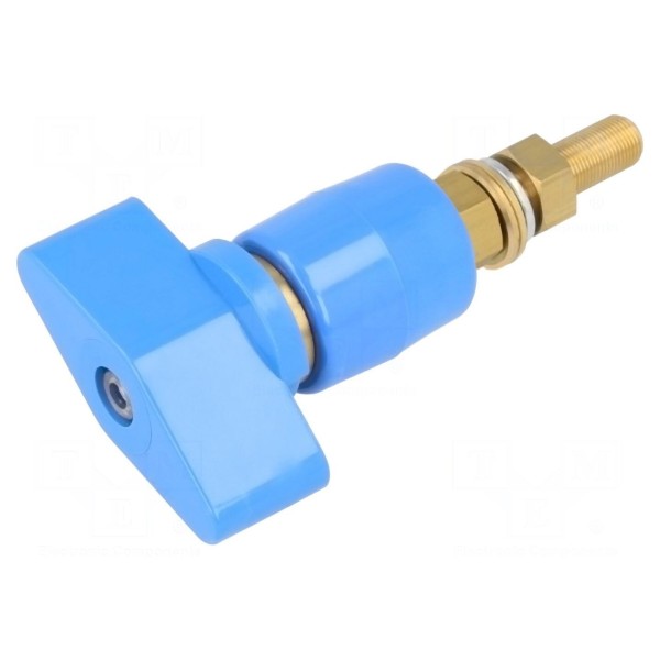 Zacisk laboratoryjny POL 201 L / BL w kolorze niebieskim jest przeznaczony do pracy przy napięciu znamionowym 1kV DC oraz prądzie znamionowym do 200A. Złącze wyposażone jest w gwint M12 o skoku 1, co umożliwia stabilny montaż na panelu za pomocą połączenia śrubowego.