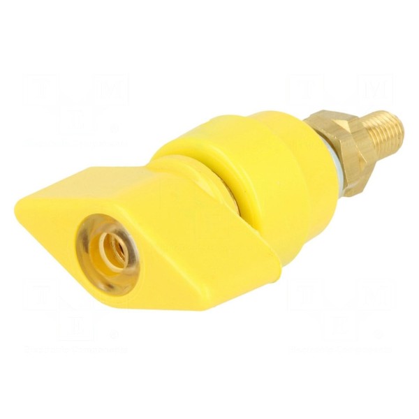 Zacisk laboratoryjny w kolorze żółtym przeznaczony jest do pracy przy napięciu znamionowym 1kV DC oraz prądzie znamionowym 63A. Komponent wyposażony jest w gniazdo o rozmiarze 4mm, co umożliwia współpracę z typowymi przewodami pomiarowymi.