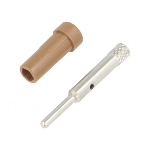 Styki wykonane z niklu posiadają niklowane pokrycie, co przekłada się na rezystancję styków na poziomie 2mΩ. Całkowita długość elementu wynosi 24,5mm. Złącze dostępne jest w kolorze brązowym.