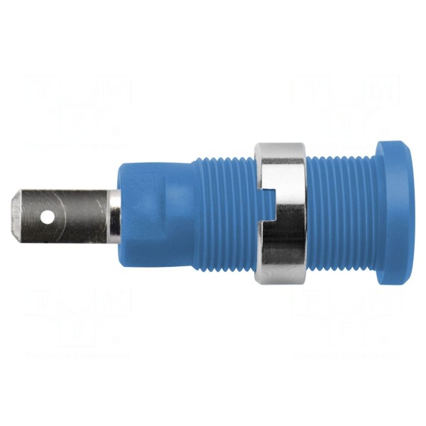 Gniazdo bananowe 2mm przeznaczone jest do montażu na panelu. Element charakteryzuje się prądem znamionowym 10A oraz rezystancją styków na poziomie 5mΩ. Złącze posiada niklowane pokrycie styków oraz izolowaną obudowę w kolorze niebieskim.