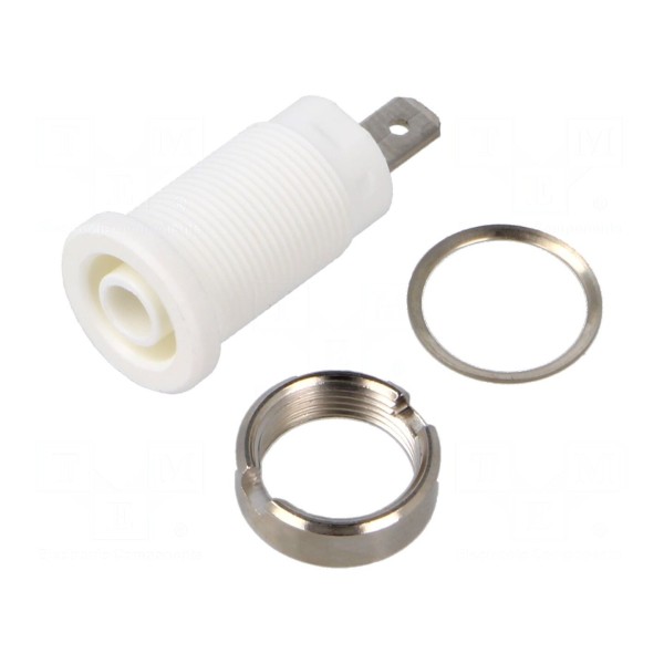 Złącze bananowe o średnicy 4 mm przeznaczone jest do montażu na panelu za pomocą połączenia śrubowego. Element wyposażony jest w niklowane styki oraz izolację wykonaną z poliamidu, co zapewnia parametry użytkowe zgodnie z normami CAT III 1000V oraz EN 61010.