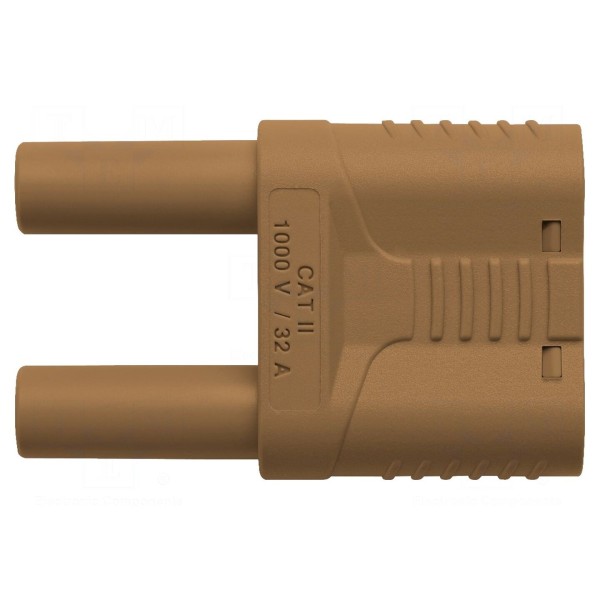 Konstrukcja komponentu obejmuje gniazdo bananowe 4mm oraz dwa wtyki bananowe 4mm. Złącze charakteryzuje się zakresem temperatury pracy od -25 do 80°C, a jego obudowa wykończona jest w kolorze brązowym.