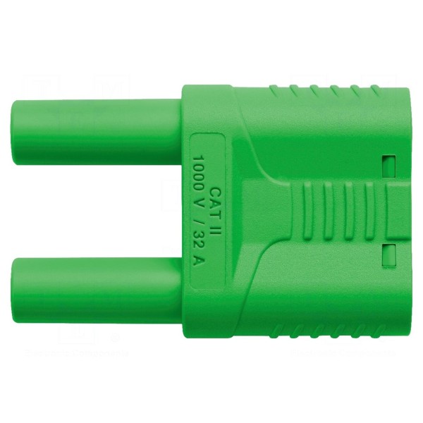 Konstrukcja złącza obejmuje jedno gniazdo bananowe 4 mm oraz dwa wtyki bananowe 4 mm. Komponent w kolorze zielonym przystosowany jest do eksploatacji w zakresie temperatur roboczych od -25°C do 80°C.