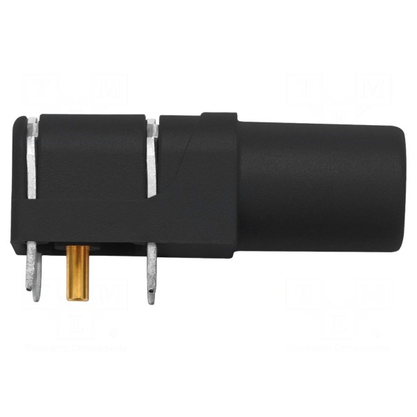 Złącze laboratoryjne typu gniazdo bananowe 4mm przeznaczone jest do montażu na obwodach drukowanych (PCB). Element charakteryzuje się napięciem znamionowym 1kV oraz prądem znamionowym 24A. Maksymalna rezystancja styku wynosi 10mΩ.