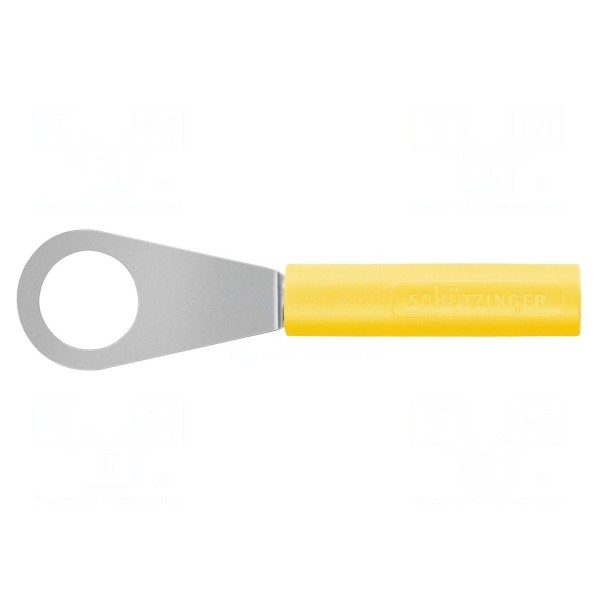 Konstrukcja złącza uwzględnia gniazdo bananowe 4 mm oraz końcówkę oczkową. Styki produktu zostały pokryte warstwą niklu, natomiast korpus wykonano z poliamidu zapewniającego izolację. Złącze przystosowane jest do pracy w zakresie temperatur od -40°C do 80°C i posiada żółty kolor obudowy.