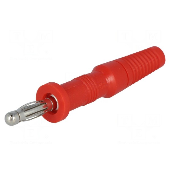 Złącze laboratoryjne typu bananowego o średnicy 4 mm przeznaczone jest do montażu na przewód. Produkt występuje w wersji nieizolowanej w kolorze czerwonym.